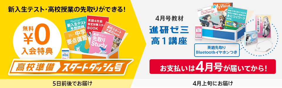 「高1講座」4月号にご入会いただいた方限定で、「高校準備スタートダッシュ号」を特別に追加受講費無料でお届けします。