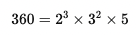 例:360 ÷ 2 = 180 ,180÷ 2 = 90,90 ÷ 2 = 45 →360= 2³ × 45 まで進む