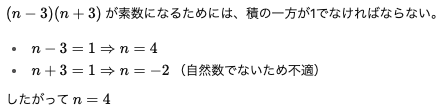 素因数分解は整数だけでなく、多項式の因数分解や整数条件の問題にも直結します。入試では「式が素数になる条件を求めよ」という形で頻出です。