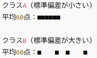 たとえば、数学の小テストで平均点が同じ60点でも、次の2つのクラスがあるとします。