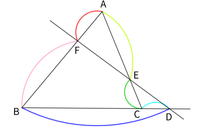 三角形ABCがあり、辺やその延長線と交わる点D・E・Fを考えます。