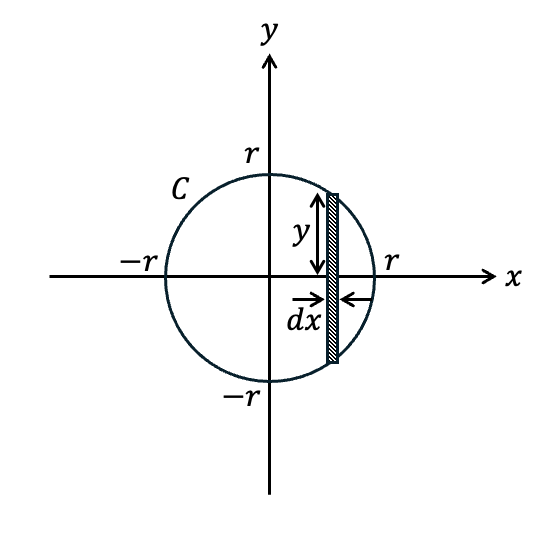 xy平面上で原点を中心とした半径rの円Cをx軸の周りに回転させた立体が半径rの球です。