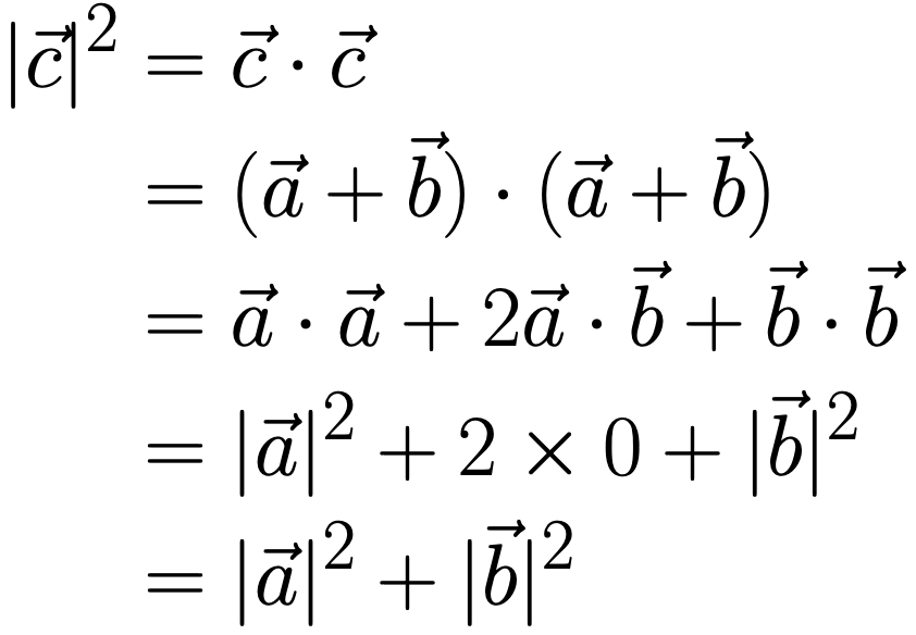 ベクトルの内積を利用して、斜辺の長さの二乗が他の二辺の二乗和に等しいことを示します。高校数学Cの範囲になります。